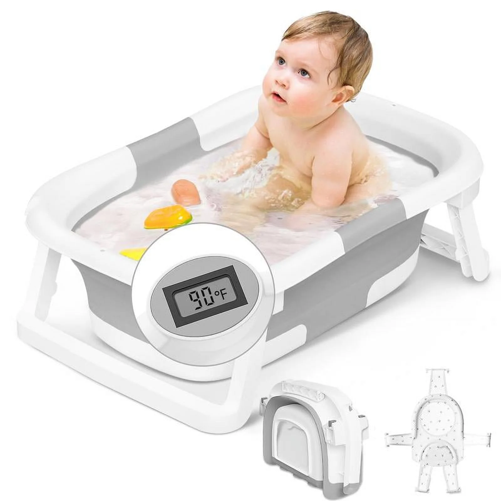 Collapsible Baby Bathtub with Real-Time Temp Monitor, Floating Cushion, Foldable Baby Bath Tub Set for Newborns & Toddlers